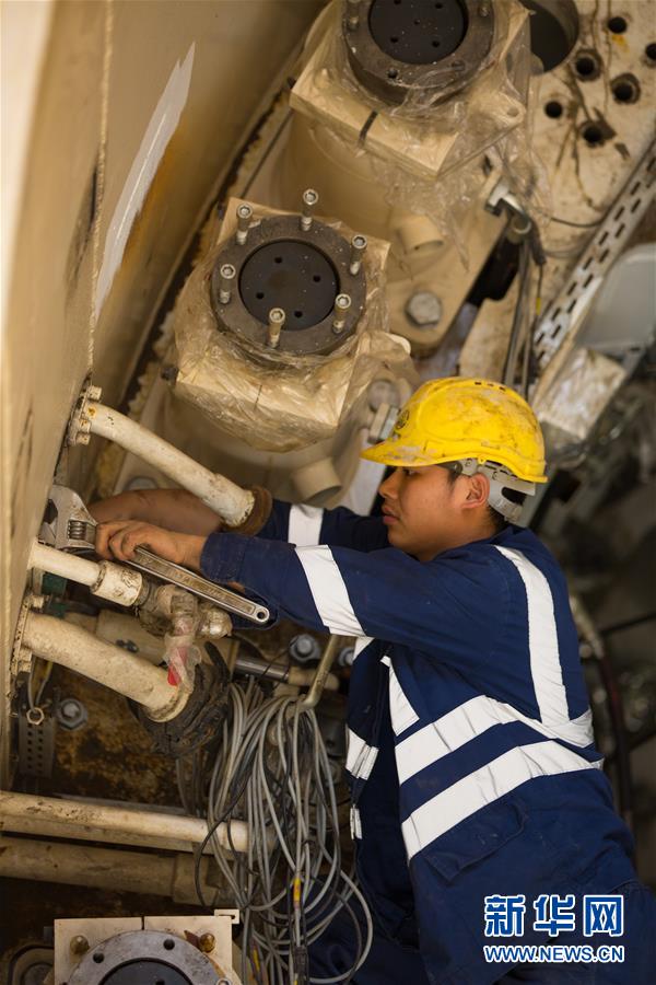 4月30日,在以色列特拉维夫轻轨红线施工现场,一名中国工人在组装盾构机。新华社记者郭昱摄