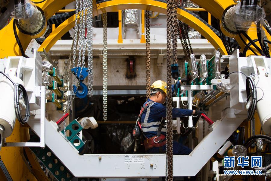 4月30日,在以色列特拉维夫轻轨红线施工现场,一名中国工人在组装盾构机。新华社记者郭昱摄