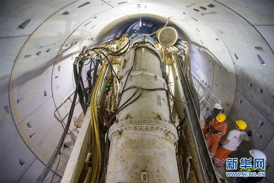 4月30日,在以色列特拉维夫轻轨红线施工现场,工人使用盾构机掘进。新华社记者郭昱摄