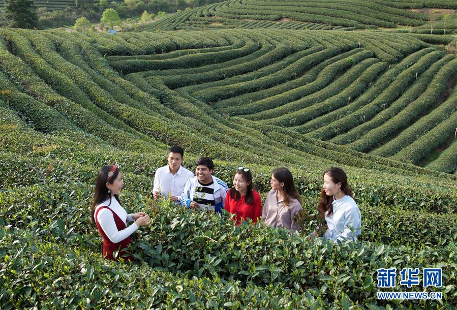 洋学生武夷山学茶艺武夷学院茶与食品学院老师陈丹妮(左一)带领留学生在校园的茶园教学基地参观学习(4月14日摄)。