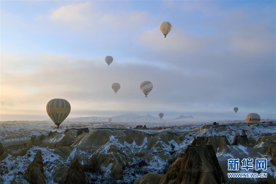 2016年12月18日,热气球从土耳其中部旅游胜地卡帕多基亚上空飞过。卡帕多基亚位于土耳其中部内夫谢希尔省,具有丰富的喀斯特地貌,每年有大量来自世界各地的游客选择乘热气球升空鸟瞰。土耳其共和国地跨欧亚大陆,领土面积78.36万平方公里,其中97%位于亚洲的小亚细亚半岛,3%位于欧洲的巴尔干半岛,首都安卡拉坐落于安纳托利亚高原西北部。伊斯坦布尔、安塔利亚和伊兹密尔等历史名城是闻名世界的旅游胜地。新华社发(穆斯塔法·卡亚摄)
