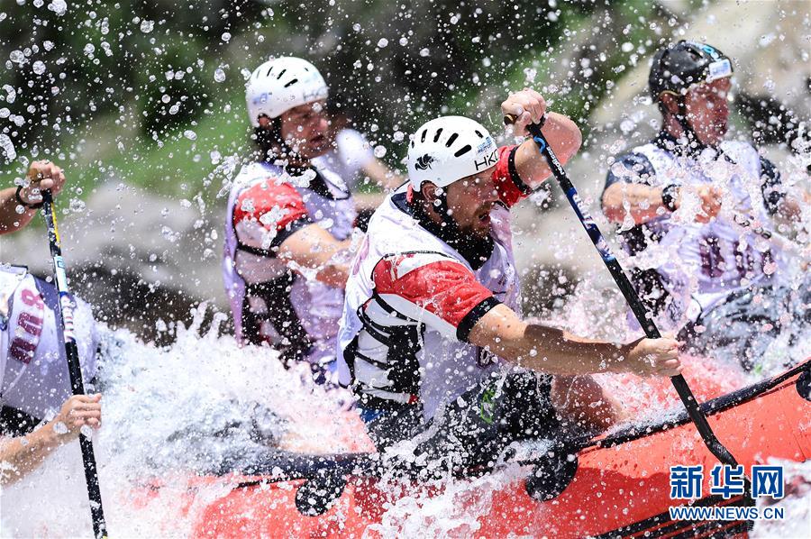来自捷克的皮划艇运动员在青海省玉树藏族自治州玉树市境内的通天河河道内进行漂流(2016年7月19日摄)。
