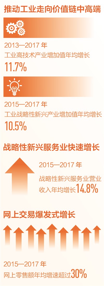 战略性新兴服务业快速增长,服务质量和水平不断提升。2015—2017年,战略性新兴服务业营业收入年均增长14.8%,高于同期规模以上服务业营业收入年均增速3.5个百分点。网上交易爆发式增长,激发了国内市场活力和消费需求。2015—2017年,网上零售额年均增速超过30%,高于社会消费品零售总额年均增速约20个百分点。
