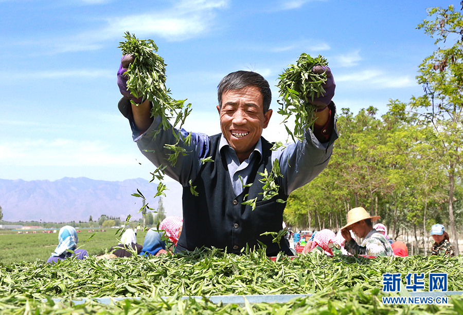5月7日,在宁夏百瑞源贺兰山东麓枸杞种植基地,330多亩枸杞芽茶迎来采摘季,银川市西夏区、贺兰县等周边地区的200多名村民下地采摘,务工增收,熟练工一天可采摘茶叶15公斤左右,能挣150多元钱。新华网 张洁龙 摄