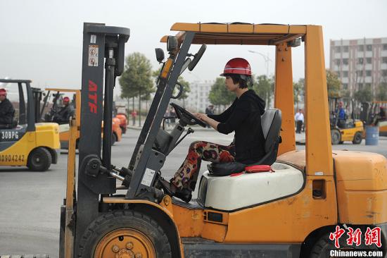 资料图:一女工驾驶叉车展示职业技能。中新社发 张浪 摄