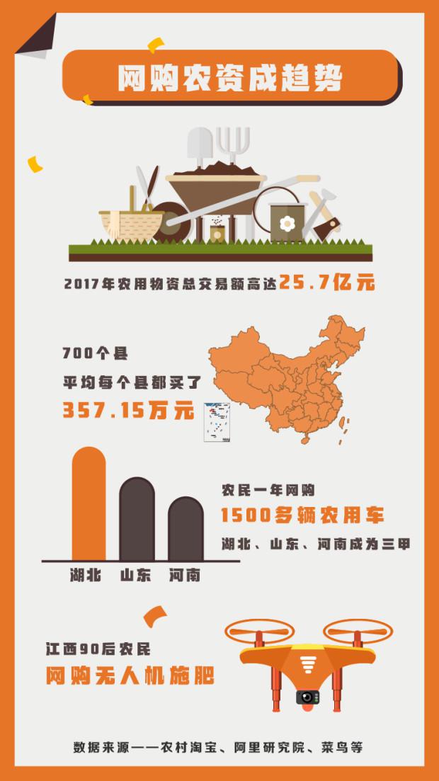 2017年,阿里巴巴平台农用物资的总成交额达到25.7亿元,以农村淘宝覆盖的全国700个县计算,平均每个县一年通过网购购买了357.15万元的农用物资。