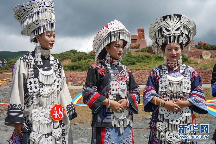 8月6日,参赛选手在比赛中。 当日,2018年凉山彝族火把节彝族传统选美大赛在昭觉县谷克德的草原上举行。来自四川、云南、贵州等地的45名彝族青年男女,通过服装展示、才艺表演、组合表演、知识问答等环节,由德高望重的长者评选出美丽的“金索玛”和威武的“金鹰”。 新华社发(吕明泽 摄)