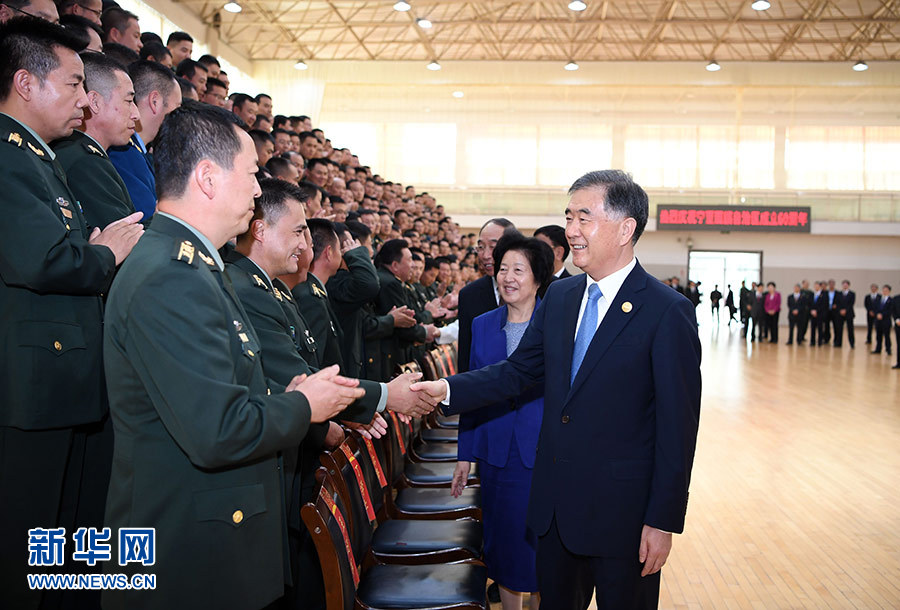 9月19日,中共中央政治局常委、全国政协主席、中央代表团团长汪洋率代表团部分成员分别赴宁夏军区、武警宁夏总队慰问,并会见自治区政法系统代表。这是汪洋慰问宁夏军区和驻宁部队官兵代表。 新华社记者 张领 摄