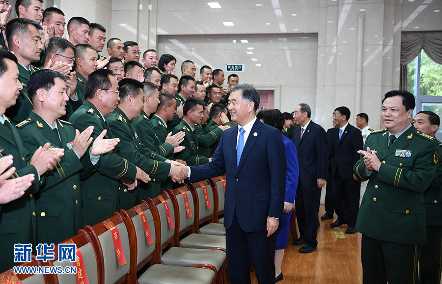 9月19日,中共中央政治局常委、全国政协主席、中央代表团团长汪洋率代表团部分成员分别赴宁夏军区、武警宁夏总队慰问,并会见自治区政法系统代表。这是汪洋慰问武警宁夏总队官兵代表。 新华社记者 张领 摄