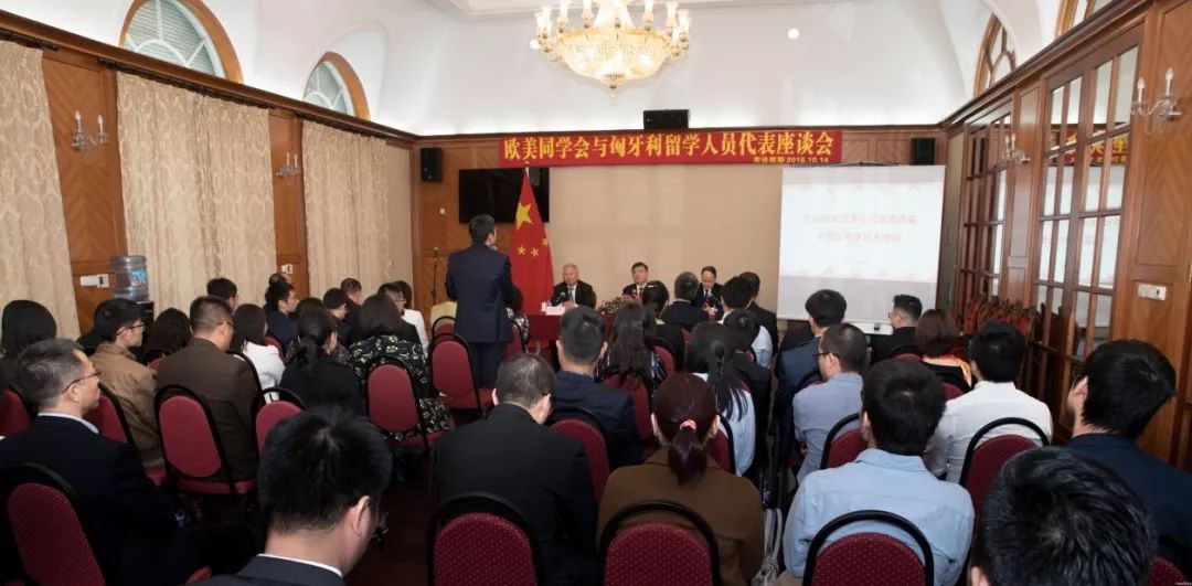 14日,陈竺、王丕君等在中国驻匈牙利大使馆与匈牙利学习的中国留学生代表见面并座谈交流。