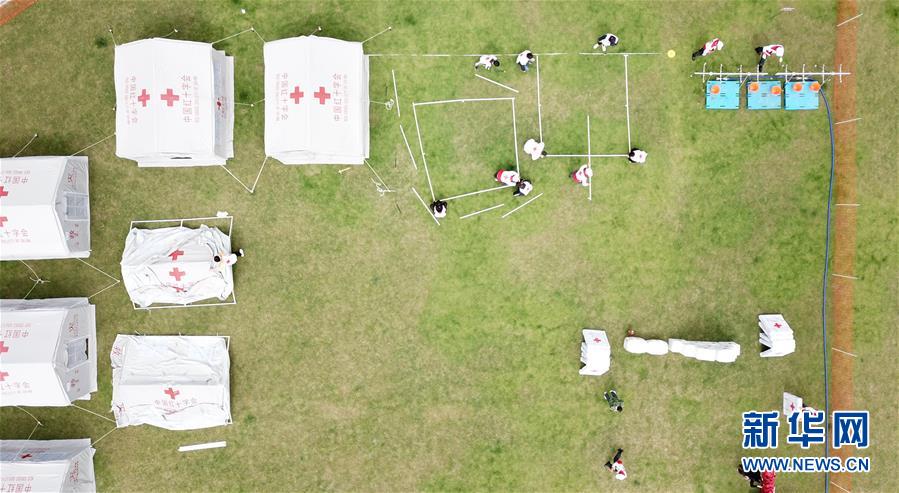 5月8日,救援人员在演练搭建救灾帐篷(无人机拍摄)。