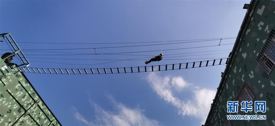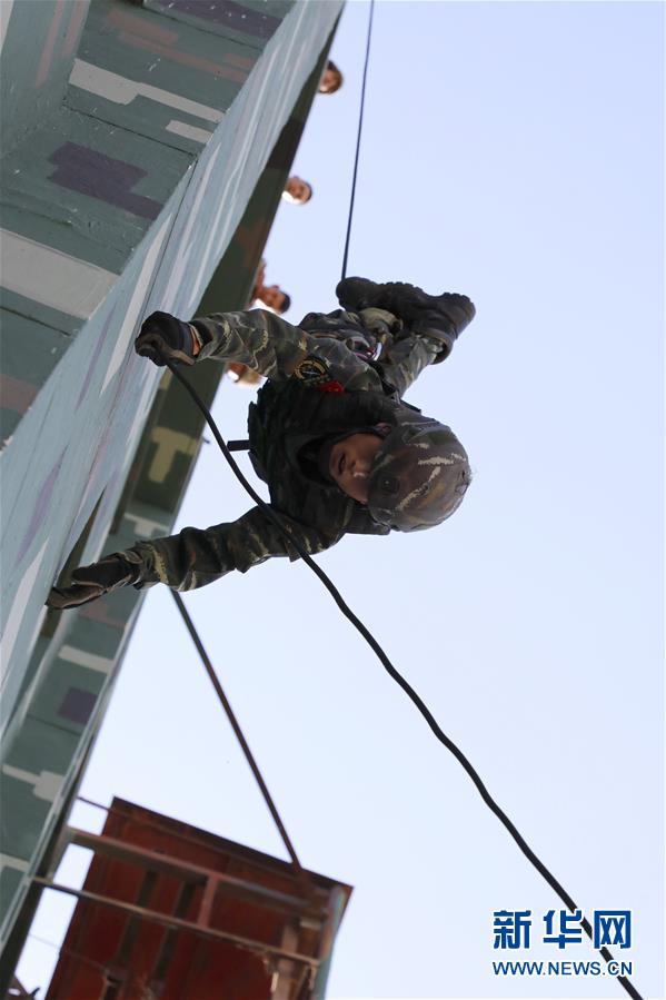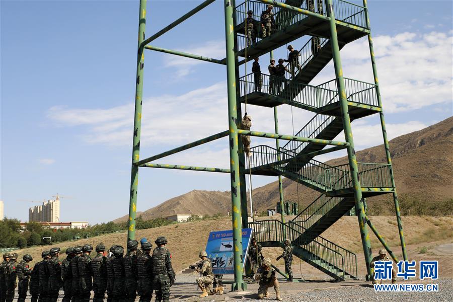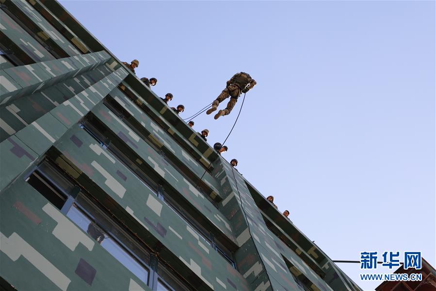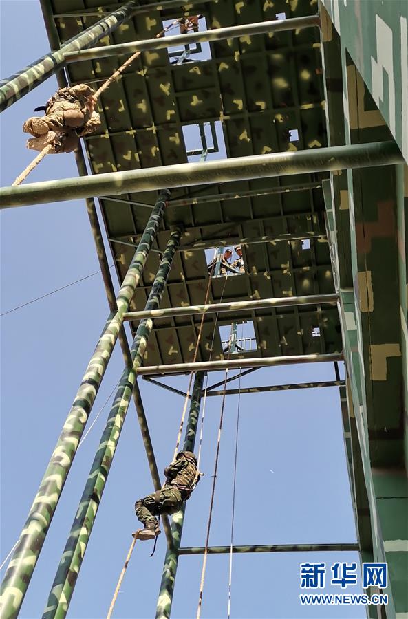 8月7日,中吉双方参演官兵进行18米抓绳上对抗训练。 当日,中吉“合作-2019”联合反恐演练开展联合训练,中吉双方参演官兵进行了特战攀岩、模拟直升机索降等训练课目。 新华社记者 刘芳 摄