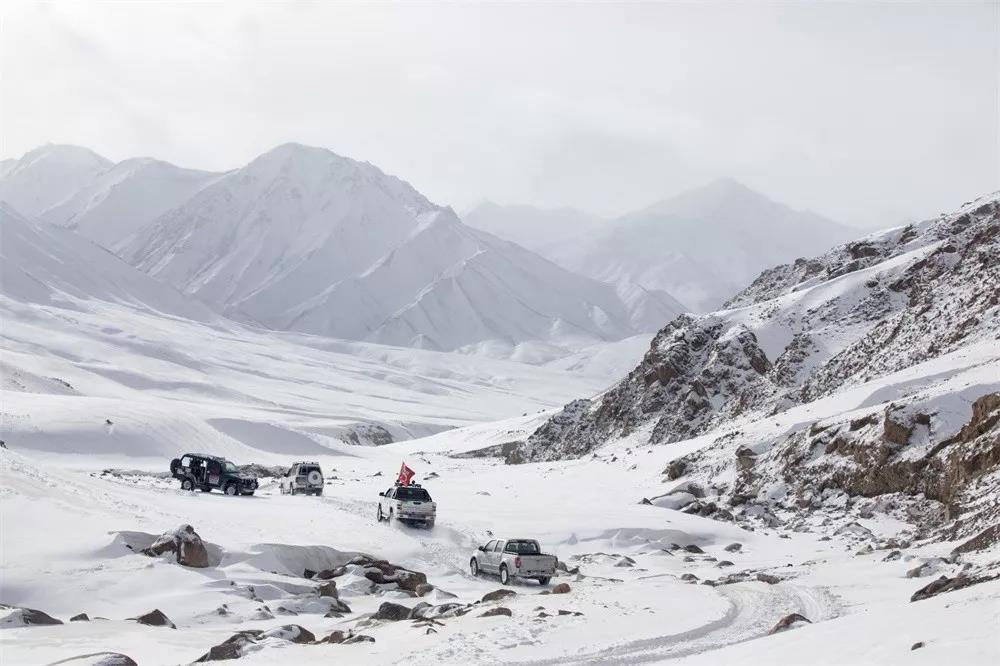 点评:在空气透视的作用下,画面由近及远、由深入淡,顶部较大面积的留白提升了画意色彩。车辆驰骋高原,飞轮扬起积雪,红旗迎风招展,为平静的自然带来几分豪迈。