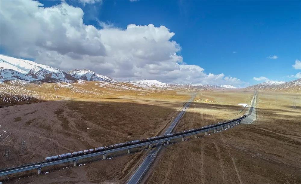 点评:格尔木是青海连接西藏、新疆、甘肃的枢纽城市,也是青藏铁路二期工程的起点,铁路与公路在画面中的交会,直观呈现了这座城市在交通战略中的重要地位。更大亮点在于澄澈的蓝天、白云与雪山,象征着人与自然的和谐关系,展现出青藏铁路建设工程的环保理念。