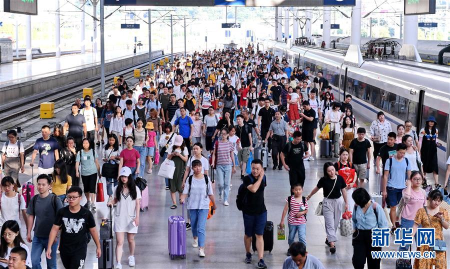 9月15日,旅客乘坐D6543次动车到达福州站。 当日是中秋假期最后一天,福州火车站迎来返程客流高峰,该站加开26趟往返动车组列车方便旅客出行。据测算,该站当日到达和出发旅客人数近20万人次。 新华社记者 林善传 摄