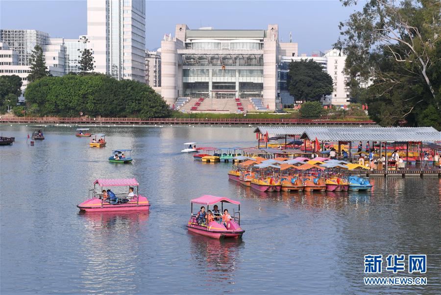 10月7日,游客在福州西湖公园乘船游玩。新华社记者 林善传 摄