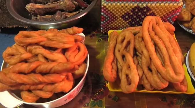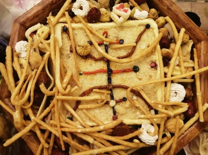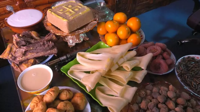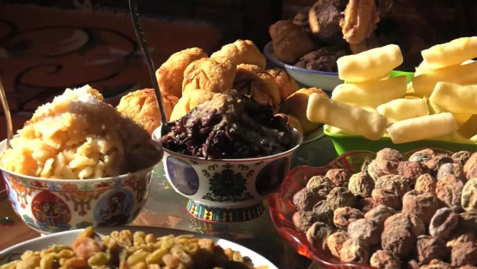 在木质的藏式条桌上从头到尾摆放着丰盛的食物,藏式油饼、蕨麻米饭、酥油搅团、各种干果水果、饮料,红的、黄的、白的色彩丰富,香味扑鼻,让人垂涎欲滴。