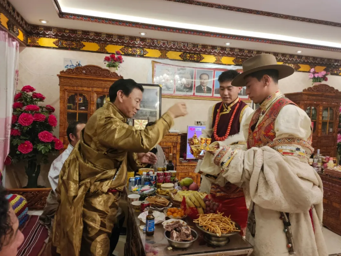按照藏族的习惯,吃完主食后,晚辈们捧起酒杯,向长辈们敬酒祝福,祈祷新的一年长辈们身体健康,万事如意。