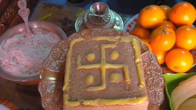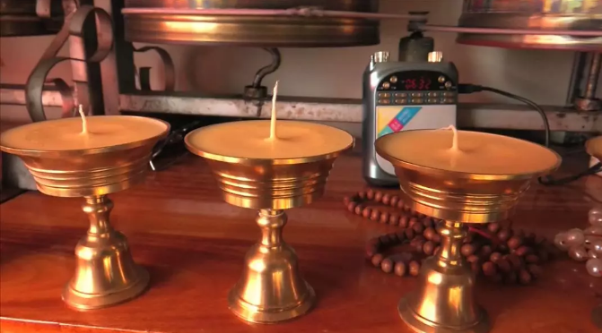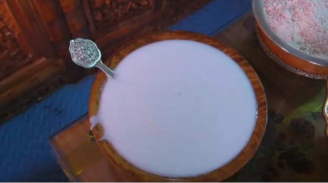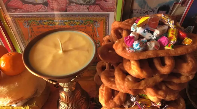 象征五谷丰登的“切玛”是每户藏族人家必备的美食,在绘有彩色花纹的木盒左右分别盛放炒麦粒和酥油拌成的糌粑,上面插上青稞穗和酥油制成的彩花,还有用水浸泡的青稞种子。