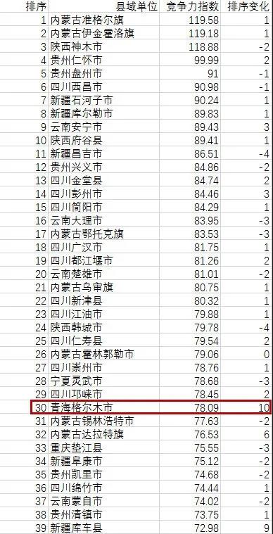 近日,中国信息协会信用专业委员会和竞争力智库发布《中国西部地区县域发展监测报告2019》,并公布“2019中国西部百强县市”名单。格尔木市位列第30位,是青海省唯一入围城市。
