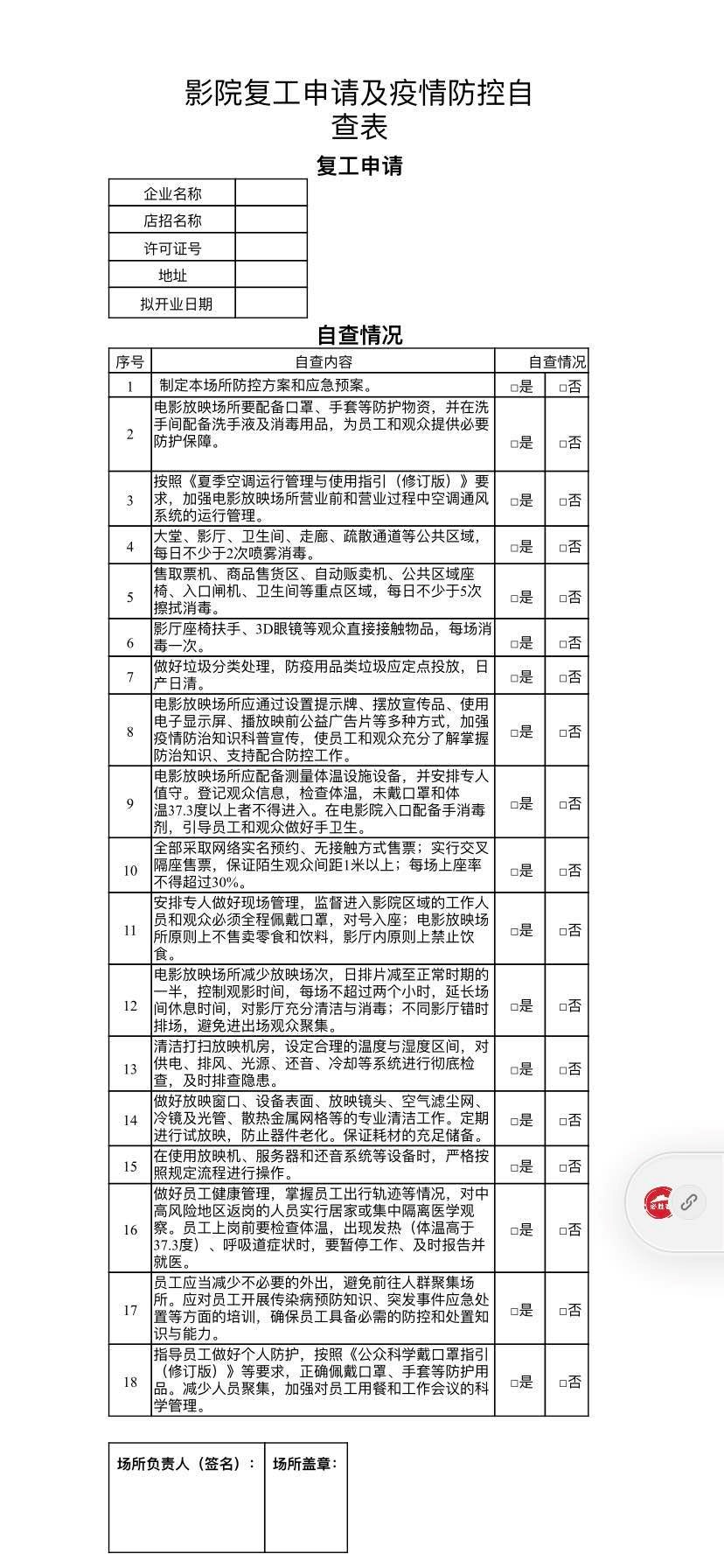 记者从上海一家影院处获得一份“复工申请”的样本,根据表格可以看到,申请开业复工的影院,需要准备制定自身场所的防控方案和应急预案;确保配备口罩、手套等防护物资,并在洗手间配备洗手液及消毒用品;大堂、影厅、卫生间、走廊、疏散通道等公共区域,每日不少于2次喷雾消毒;售取票机、商品售货区、自动贩卖机、公共区域座椅、入口闸机、卫生间等重点区域,每日不少于5次擦拭消毒等非常具体的一些列防疫举措。