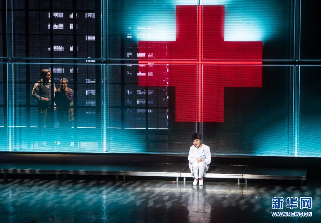 2020年9月11日,演员们在湖北省武汉市中南剧场表演抗疫题材话剧《逆行》。