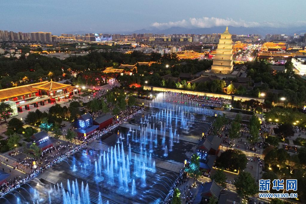 2019年7月26日拍摄的日暮时分的陕西省西安市大雁塔文化休闲景区(无人机照片)。