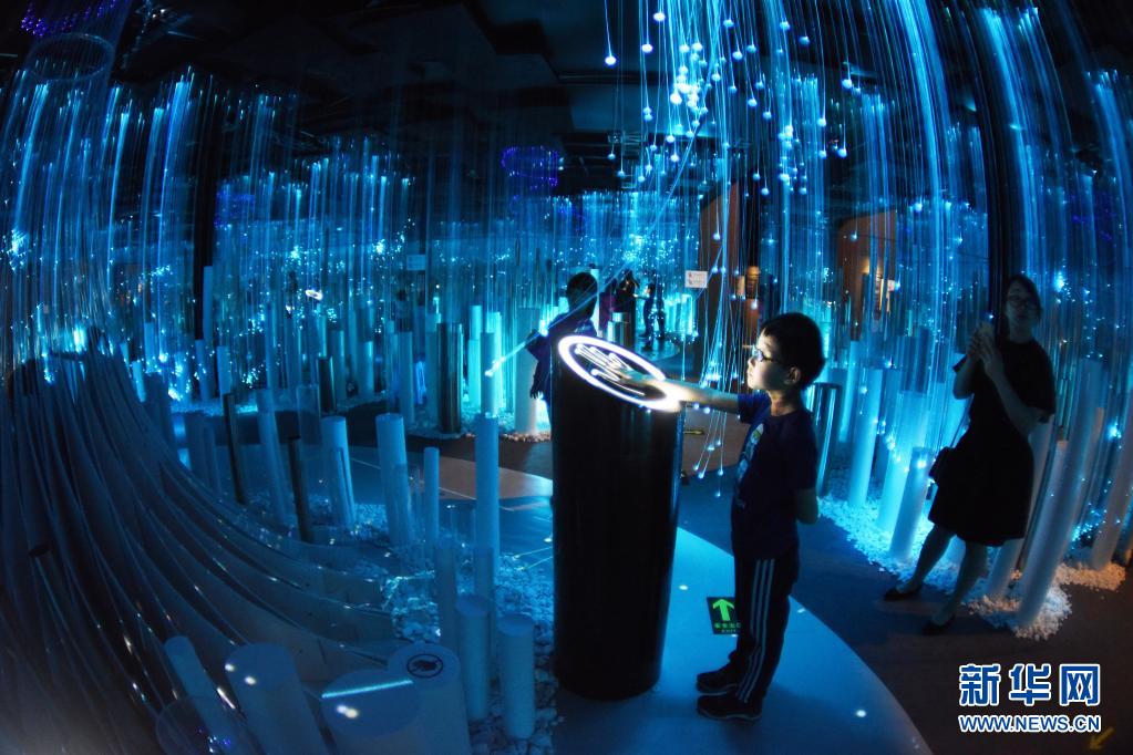 2019年5月27日,在贵州省贵阳市举行的2019中国国际大数据产业博览会“追梦·未来”数字艺术特展上,观众体验艺术作品《数据笙林》。