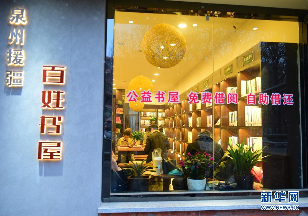 2021年3月5日,在新疆昌吉回族自治州昌吉市,读者在由福建泉州援建的百姓书屋阅读。