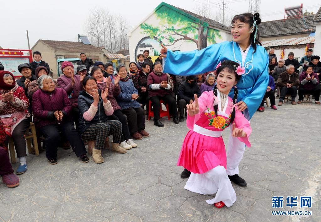 2021年3月5日,在安徽省全椒县六镇镇赵店村新时代文明实践广场,志愿者在表演黄梅戏《喜看农家好光景》。