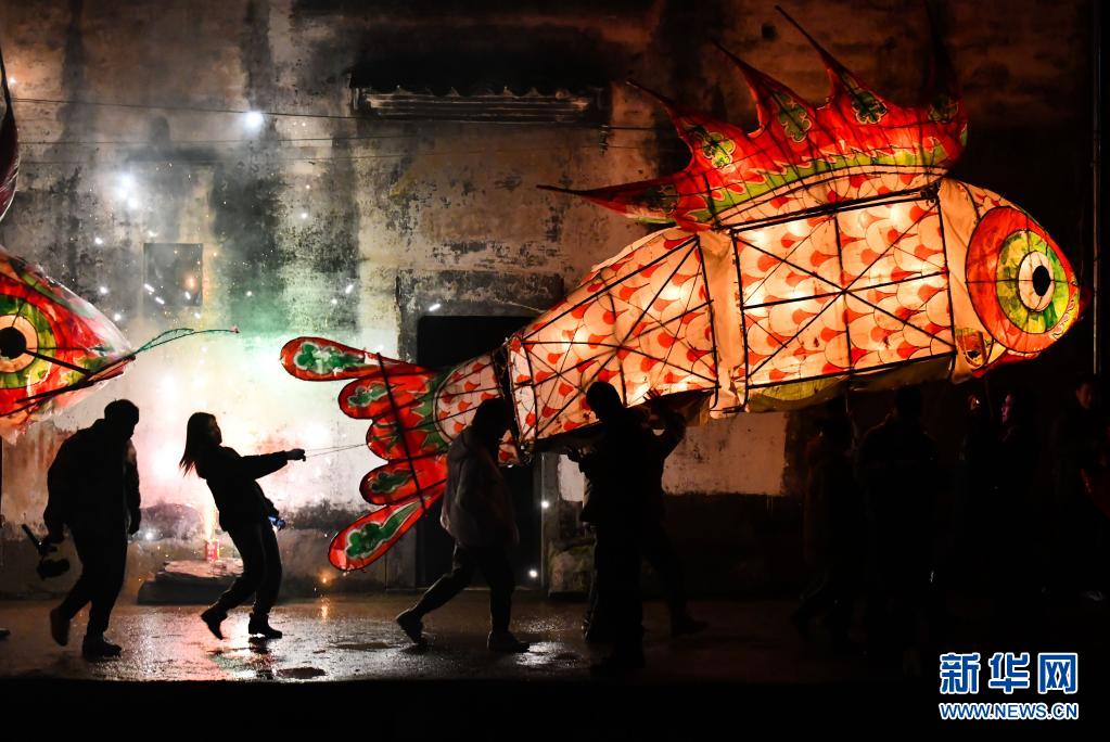 2021年2月26日是农历正月十五元宵节,在安徽省黄山市歙县溪头镇汪满田村,游客和村民嬉鱼灯,闹元宵。