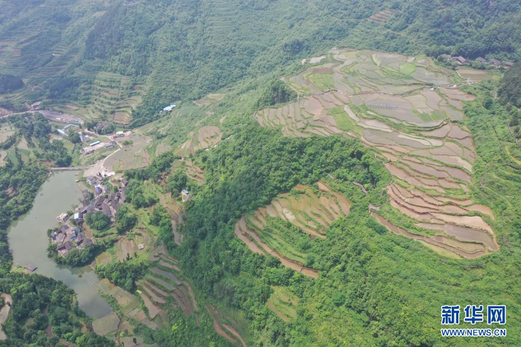 这是贵州省铜仁市松桃苗族自治县盘石镇的梯田(6月12日摄,无人机照片)。连日来,在贵州省铜仁市松桃苗族自治县盘石镇响水梯田晚稻种植基地,村民抢抓农时耕田、起秧、插秧,种植优质晚稻,一片繁忙景象。新华社记者 杨楹 摄