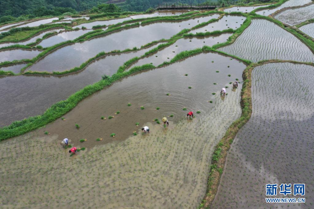 6月12日,村民在贵州省铜仁市松桃苗族自治县盘石镇响水梯田晚稻种植基地抢种优质晚稻(无人机照片)。连日来,在贵州省铜仁市松桃苗族自治县盘石镇响水梯田晚稻种植基地,村民抢抓农时耕田、起秧、插秧,种植优质晚稻,一片繁忙景象。新华社记者 杨楹 摄