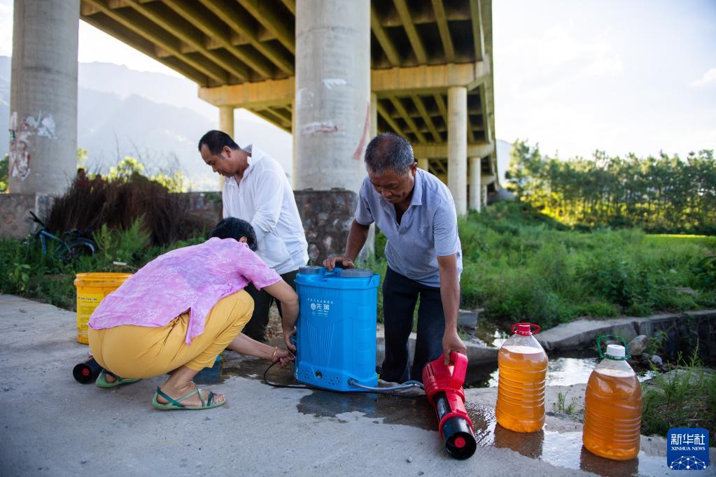 8月30日,在湖南省永州市寿雁镇深田村,村民唐志龙(右)、何中庆(中)和唐平秀(左)在农田附近,准备对酿制好的“环保酵素”进行稀释,制作肥料。