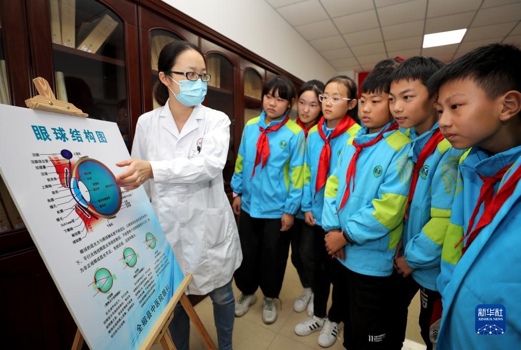 10月13日,安徽省全椒县中医院眼科医生给学生讲解眼睛结构知识。