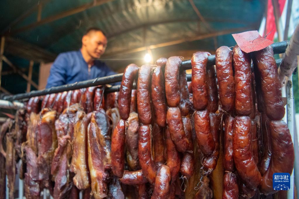 12月18日,在位于重庆市渝北区龙溪街道的“无烟熏制腊肉便民服务点”,工作人员在整理熏制好的腊味年货。