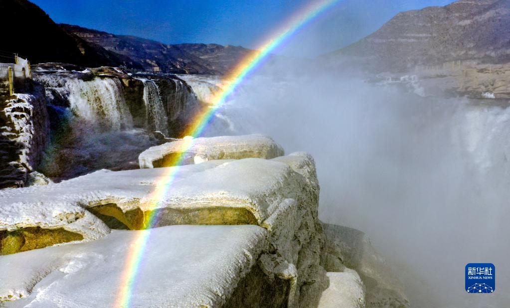 近日,随着气温骤降,黄河壶口瀑布呈现出别样奇观:飞溅的浪花,在两岸崖壁之上凝固成巨大冰瀑,点缀着一条条银装素裹的冰柱,玲珑剔透,错落有致;激起的水雾,在阳光的映射下,彩虹横亘其间,宛如一幅幅画卷。