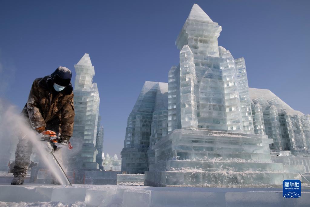 12月22日,工人在哈尔滨冰雪大世界园区施工。