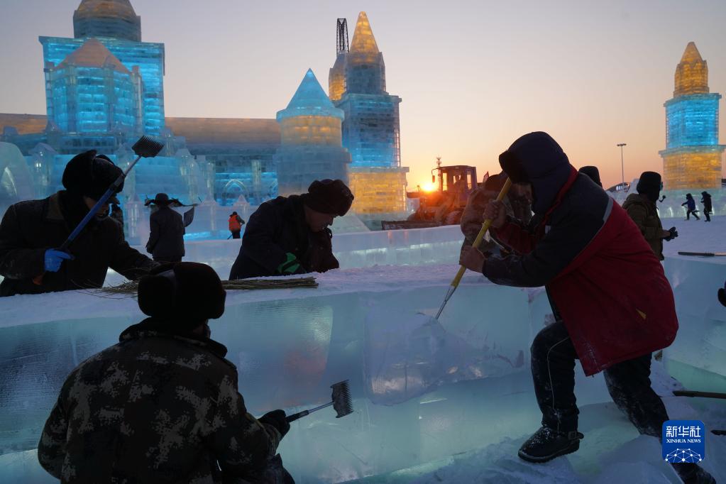 12月23日,工人在哈尔滨冰雪大世界园区施工。
