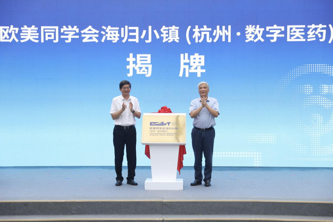 9月13日下午,欧美同学会海归小镇(杭州·数字医药)揭牌仪式在杭州市萧山区举行。全国人大常委会副委员长、欧美同学会(中国留学人员联谊会)会长丁仲礼,浙江省委常委、统战部部长邱启文出席仪式并共同为海归小镇(杭州·数字医药)揭牌。杭州市委副书记、市长刘忻致辞,欧美同学会副会长、自然资源部原副部长曹卫星讲话。欧美同学会党组书记、秘书长王丕君宣读《关于同意欧美同学会海归小镇(杭州·数字医药)运营启动的函》。仪式由杭州市委常委、萧山区委书记王敏主持。