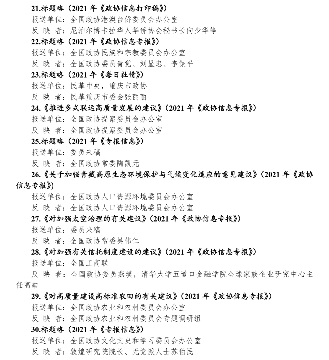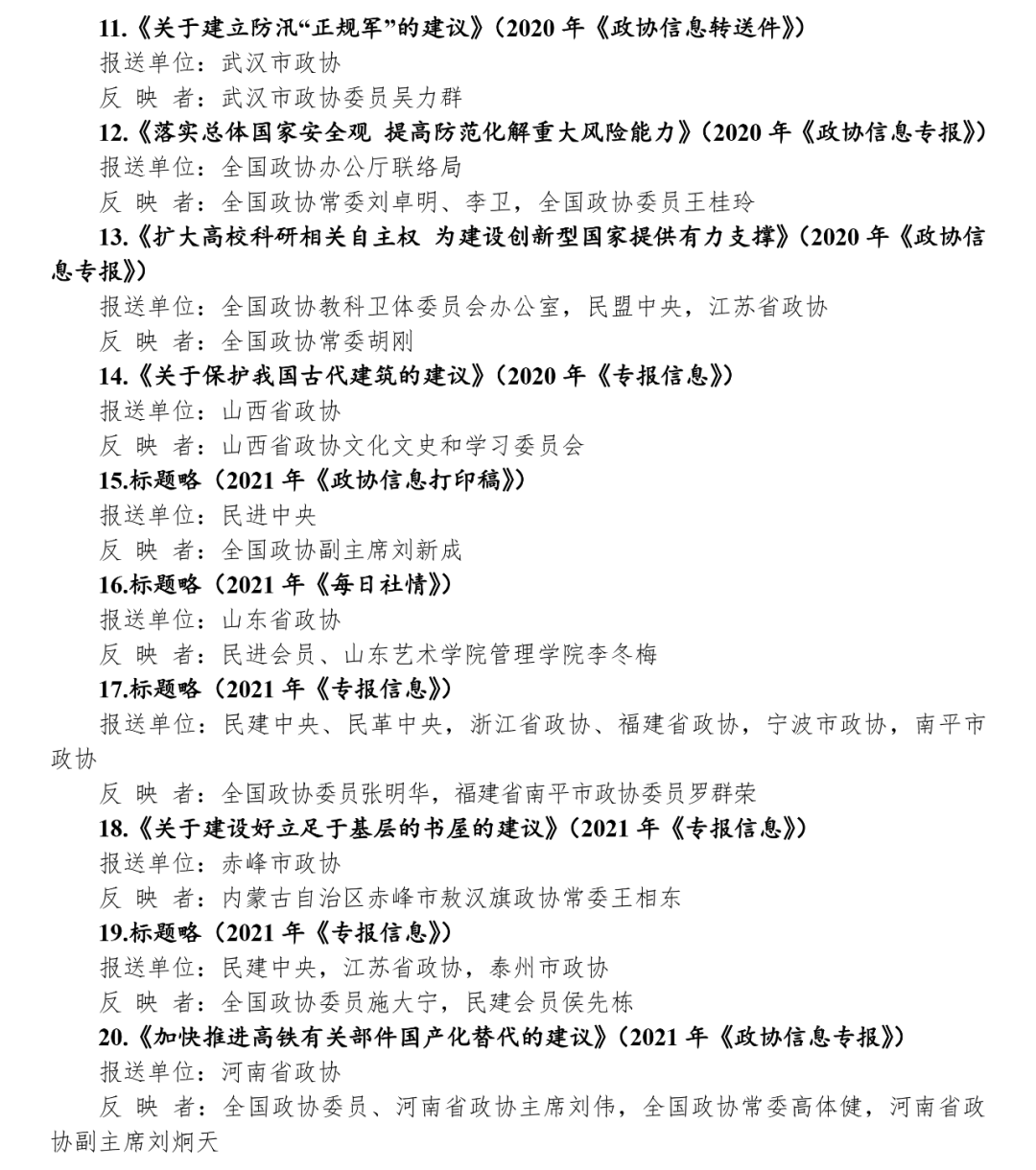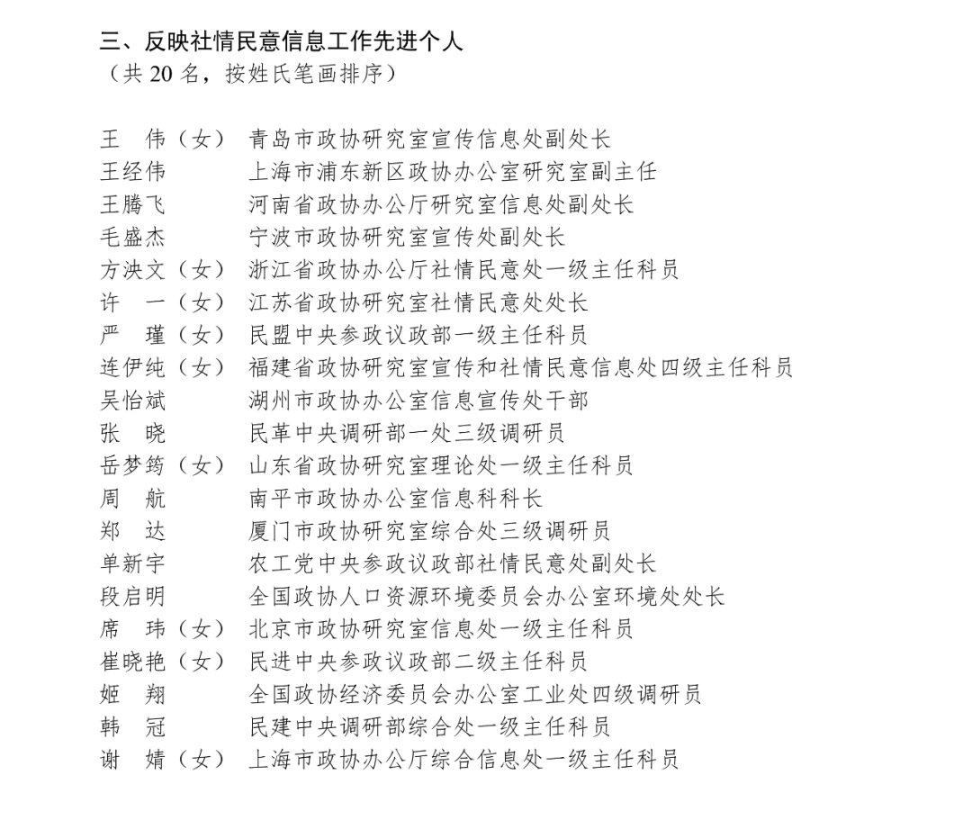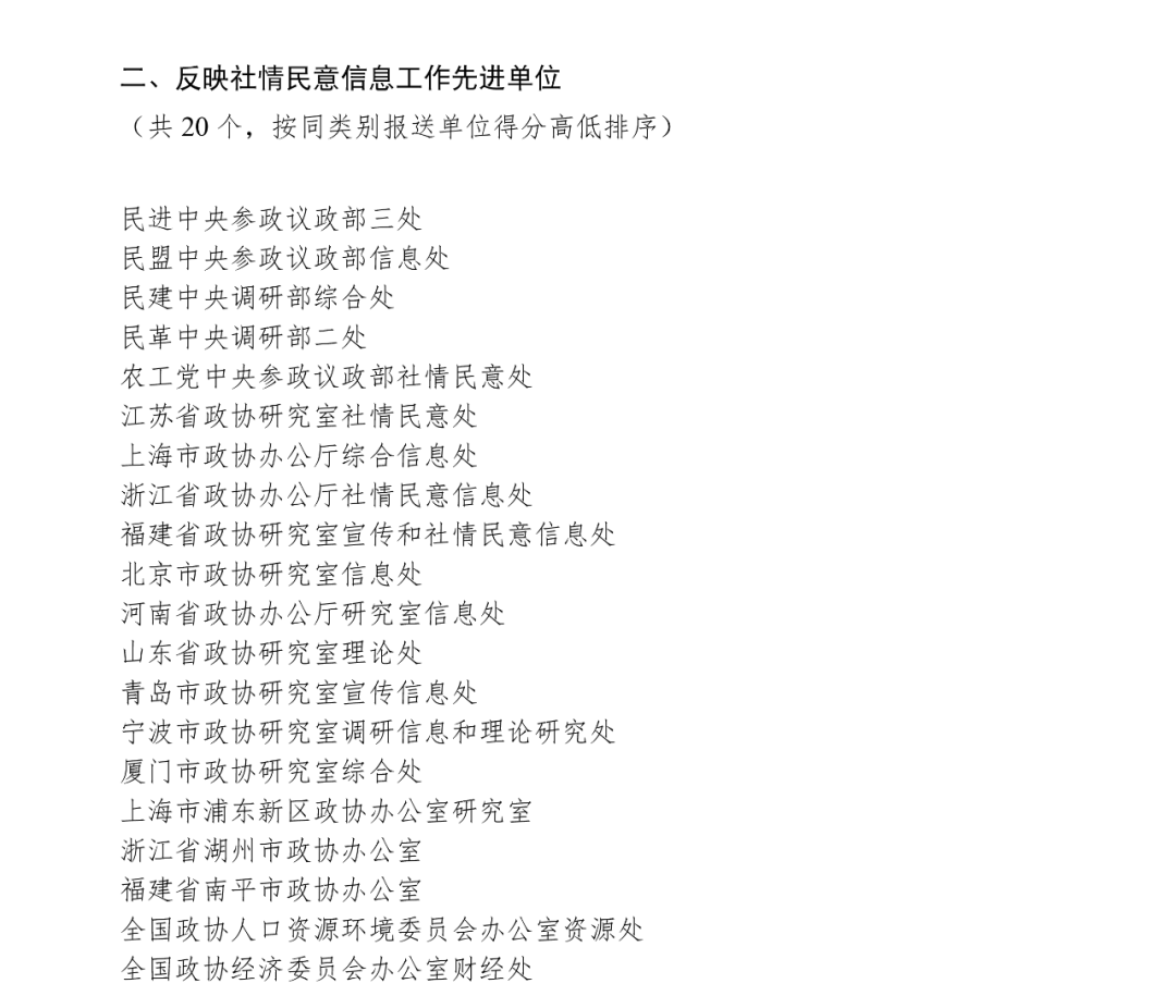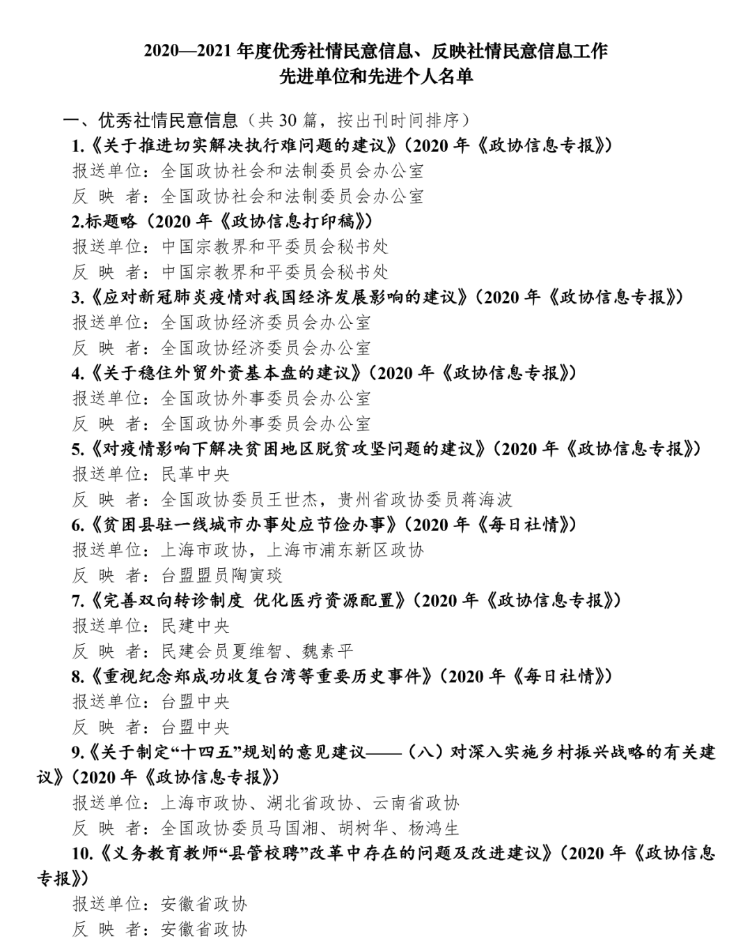 全国政协办公厅近日作出决定,对2020—2021年度优秀社情民意信息、反映社情民意信息工作先进单位和先进个人进行表彰。
