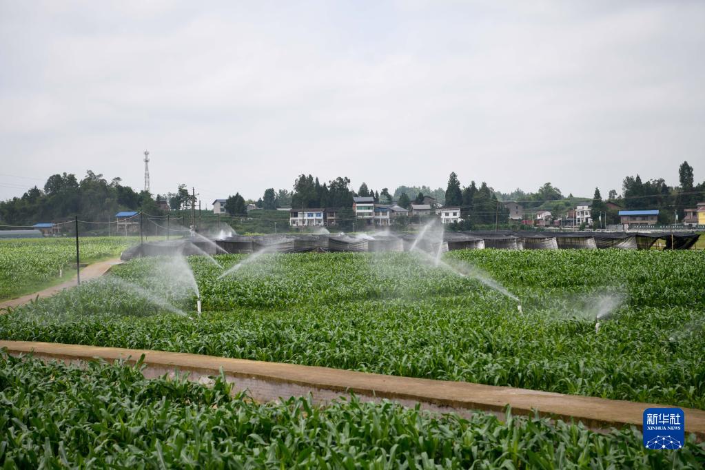 5月24日,在达州达川区万家镇一大豆玉米带状复合种植示范片,自动喷灌系统在浇水。