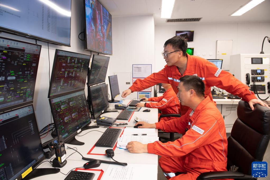 6月1日,在中国海油恩平15-1原油钻采平台上的中控室,工作人员查看二氧化碳回注情况。