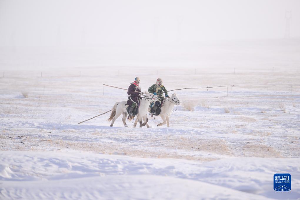 12月20日,内蒙古锡林郭勒盟西乌珠穆沁旗的牧民在雪原上准备驯马。