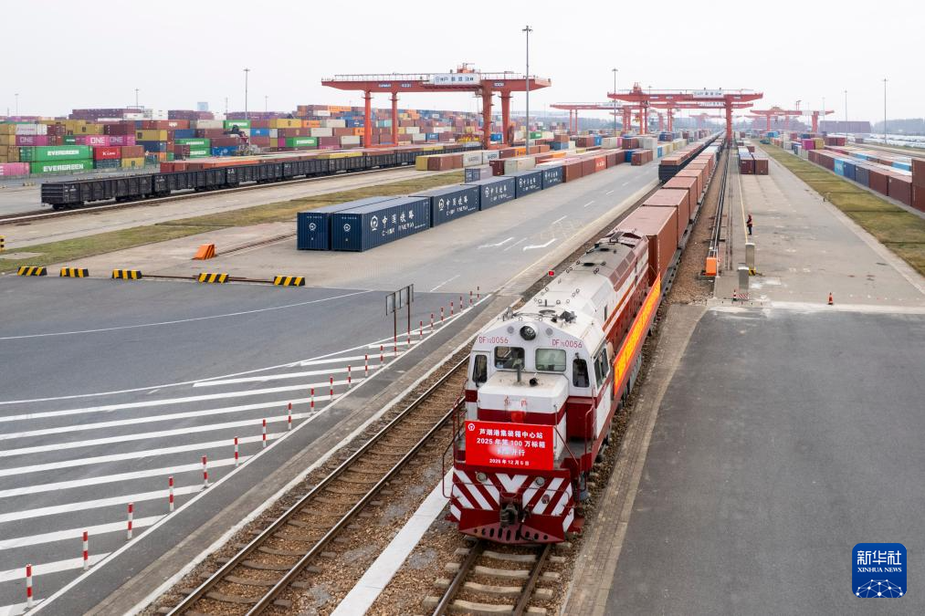 12月5日,一趟载有太阳能光伏组件、汽车零配件等货物的海铁联运班列从上海芦潮港集装箱中心站开出,标志着2025年以来上海海铁联运业务量突破100万标箱,同比增长近两成,创历史新高。