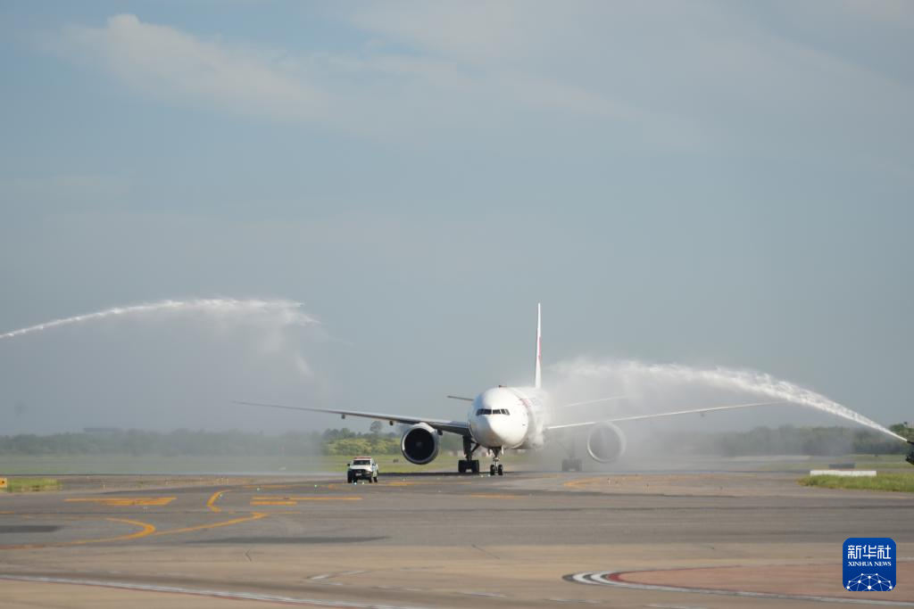 中国东方航空公司MU745航班4日抵达阿根廷首都布宜诺斯艾利斯的埃塞萨国际机场,缓缓穿过象征民航最高礼仪的“水门”。这标志着中阿两国之间首条直航航线开通。